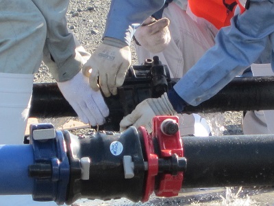 ・災害などにより配水管が破断して漏水している状況を想定し、断水したうえで破断箇所を切断し、別の管種(PCジョイント)布設替え して漏水を止める。
